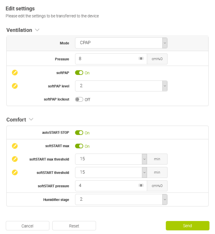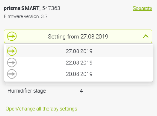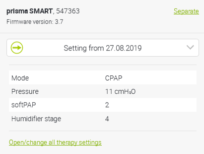 Settings overview shows the last transmitted therapy settings of the device, whether changed on the device or via prisma CLOUD.
